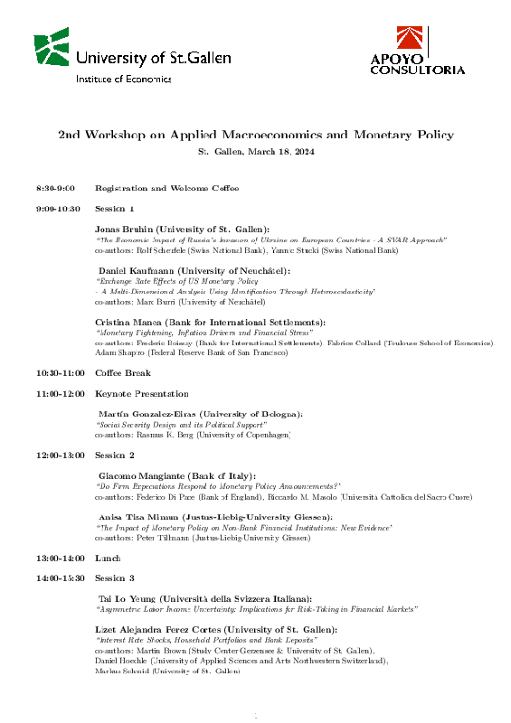 On March 18th, 2024, the Institute of Economics of the University of St. Gallen and APOYO Consultorìa organized the second edition of the Workshop on Applied Macroeconomics and Monetary Policy, which was held in the Square building of the University of St. Gallen, Switzerland.