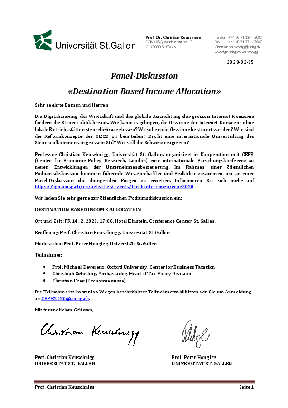 The panel brings together scientists and practitioners of tax policy. Digitization and the global activities of internet companies challenge tax policy. How should internet companies without local production units be taxed? Where is profit income to be taxed? What are the merits and problems of the OECD tax proposals? Will they entail a large redistribution of tax revenue? How should Switzerland react?