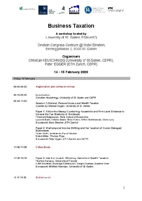 The workshop aims to bring together researchers with a focus on business taxation. A mix of theoretical and empirical studies explore the effects of business taxation on firm-level decisions and aggregate economic performance. The program includes sessions on
