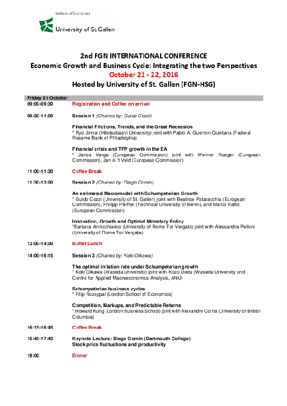 The slow recovery experienced by several countries after the global financial crisis and ensuing recessions, stagnations, and deflationary pressures rendered apparent the need to explore the high degree of persistence of business cycle shocks and the mechanisms responsible for medium term fluctuations. This strongly encourages the investigation of a unified approach to the study of both trend and cycle. This conference aims to bring together researchers from growth, business cycle, and all related fields of macroeconomics with an explicit research interest in jointly investigating macroeconomics fluctuations and economic growth. We hope to attract a mix of theoretical and empirical skills to better study the issues that may arise in the joint modelling of fluctuations and and growth.