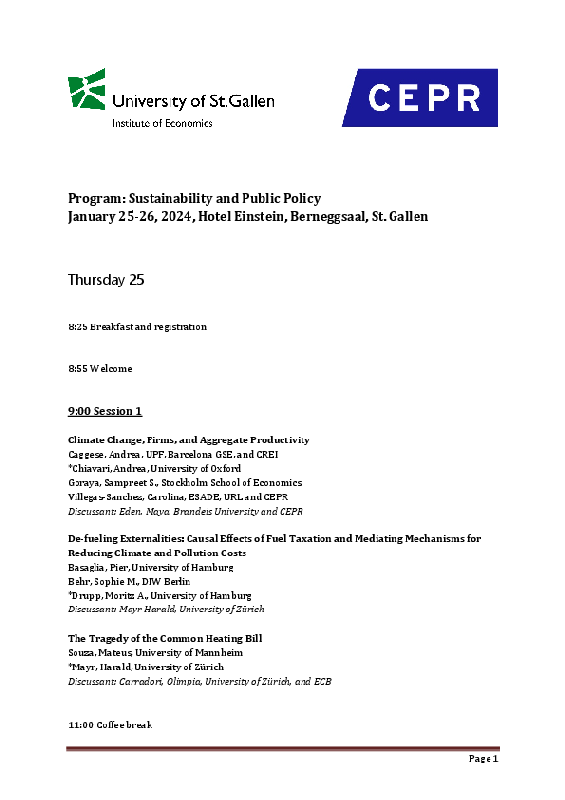 The workshop aims to bring together researchers with a focus on public economics and environmental economics. We aim at a mix of theoretical and empirical studies that explore the tools of public policy to combat climate change and preserve the environment, and the impact on firm-level and household decisions and on aggregate economic performance.